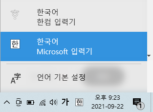 3. 화면 아래의 ㅎ(한컴 입력기)모양과 유사한 곳은 클릭하여 Microsoft 입력기를 다시 클릭하여 변경해준다. 다른 간단한 방법으로는 단축키인 Ctrl + Shift 키를 한번 더 누르게 되면 간단하게 해결 가능하다.
