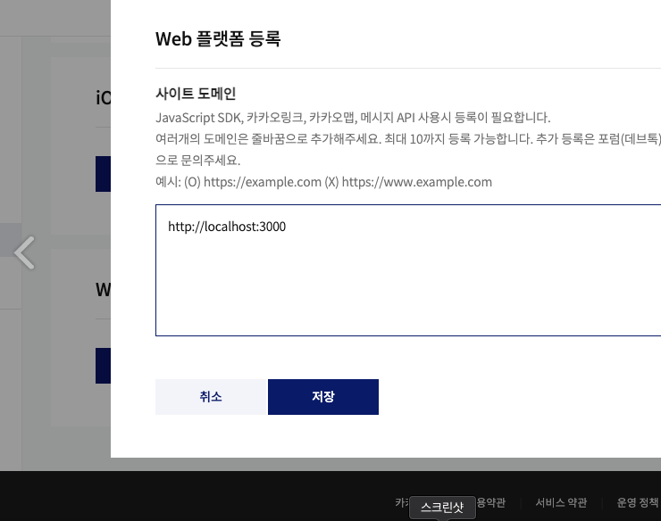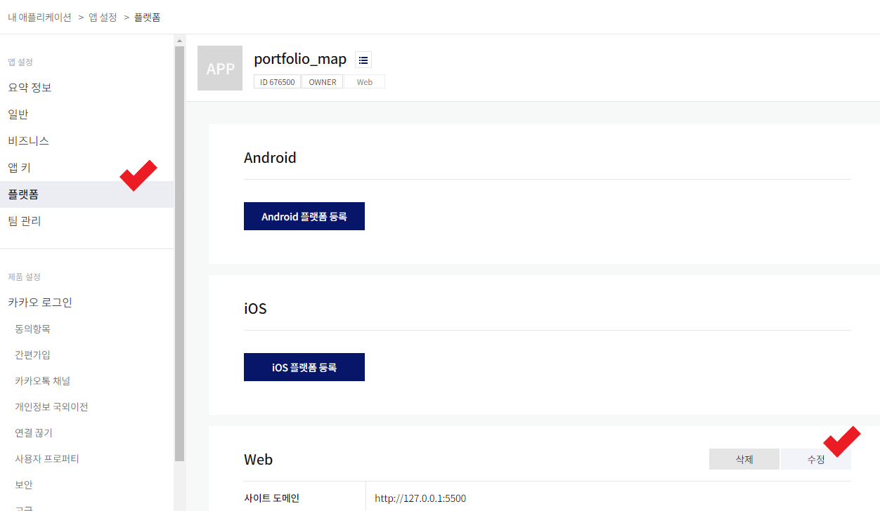 하지만 그랬는데도 안되면 도메인 문제일 확률이 높다. 등록한 애플리케이션에 들어가서 왼쪽 메뉴탭에 플랫폼을 선택하고 아래 사진처럼 수정을 눌러준다.