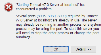 1. 작업 관리자를 열어 현재 작동 서버 강제종료 후 이클립스 재실행