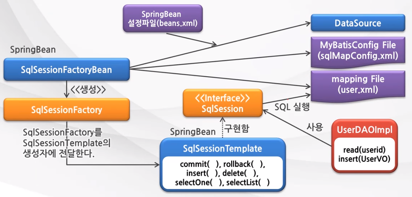 - SqlSessionFactory : MyBatis 설정파일을 바탕으로 SqlSessionFactory를 생성한다, Spring Bean으로 등록해야 한다.