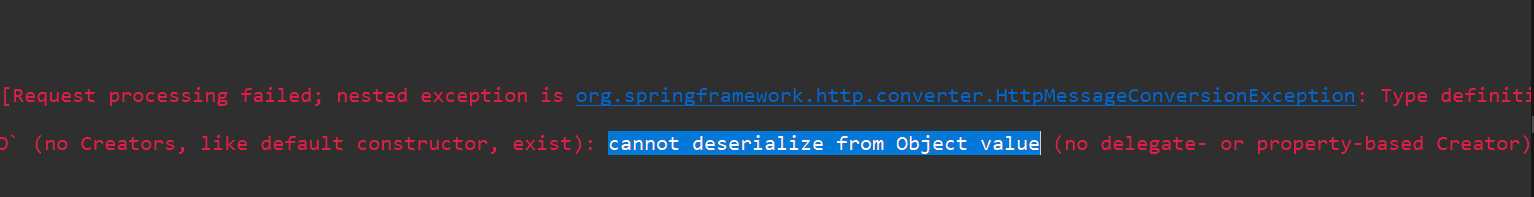 jackson library가 빈 생성자가 없는 모델을 생성하는 방법을 모르기 때문에 그 값들을 받아줄 형태로 기본 생성자가 필요하다. 그렇기 때문에 오류 해결을 위해 vo 클래스에 빈 생성자를 추가해주어야 한다.