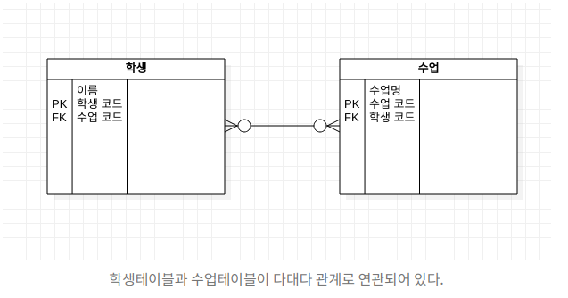 아래 그림은 학생과 수업의 관계를 나타내는 테이블인데 다대다의 관계를 가지고 있다